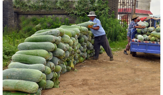 随州网讯 随州高新区淅河镇魏家畈村组织农民开展立体套种,让农民增收。图为村民正在收摘种植的冬瓜,准备运往武汉的蔬菜市场。 (记者 孙洪涛 通讯员 王涛 摄)