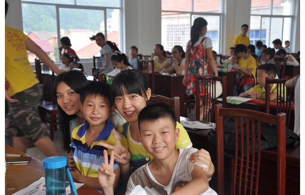 随州网讯 近日,武汉大学第七届留守儿童关爱活动,在随州市随县柳林镇古城畈村举行。图为武汉大学种太阳柳林分队的志愿者们与孩子们在一起。(记者 周强 通讯员 颜梓同摄)